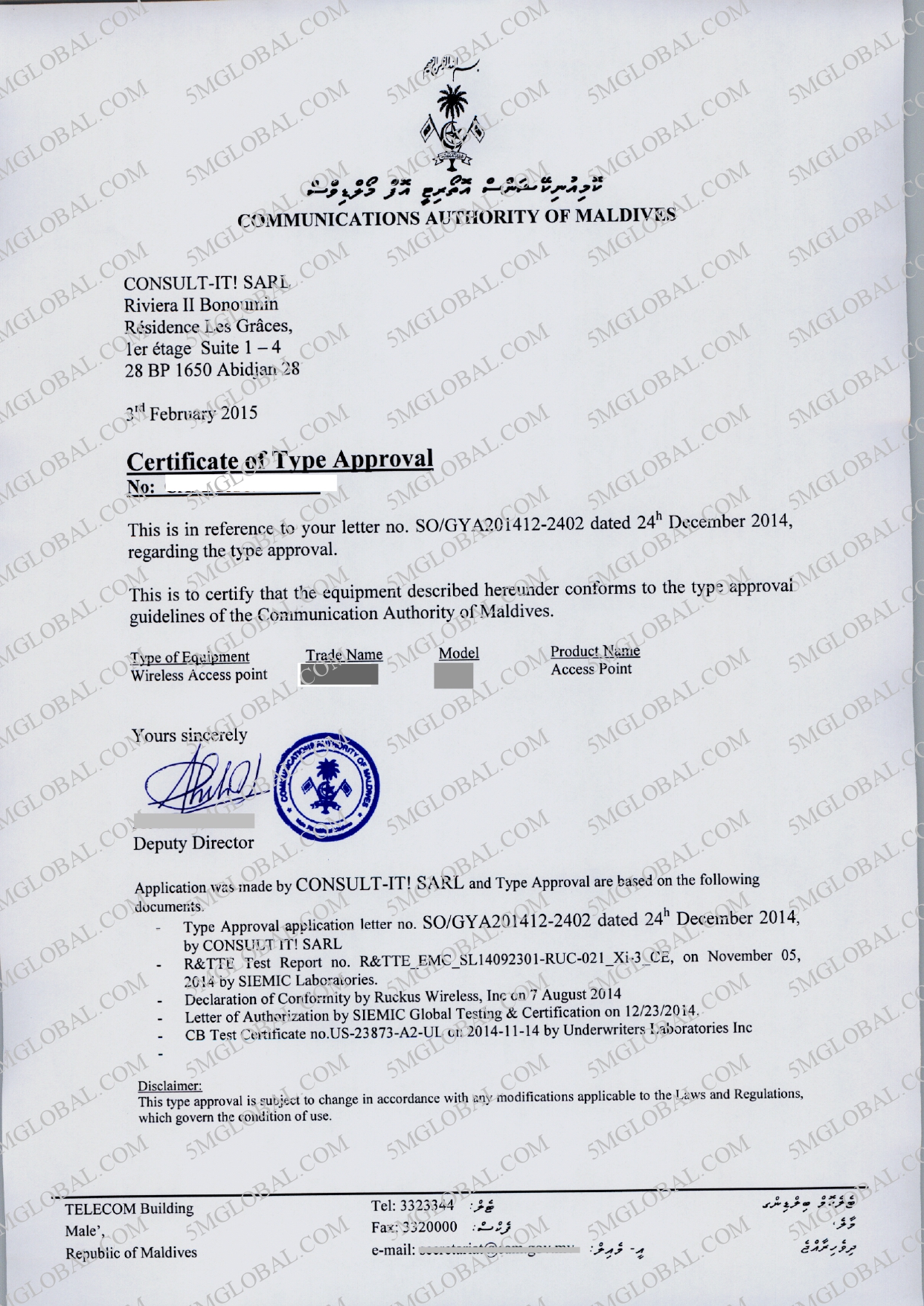 Communications Authority of Maldives . This means that we can ensure all your applications for regulatory Homologation in Maldives are processed fast and without undue complications. The range of products that we can get Homologation for is extensive and includes products that come under the category of Telecommunications, Wireless, Radio, Short Range devices and IoT devices. Since we started operations, we have done multiple Regulatory Homologation in Maldives for various manufactures and Labs. Our specialty is that we have direct contact with the authority through a specific employee in country, who will handle all your Regulatory Homologation needs. 5M Global provides a complete service for Regulatory Homologation in Maldives.