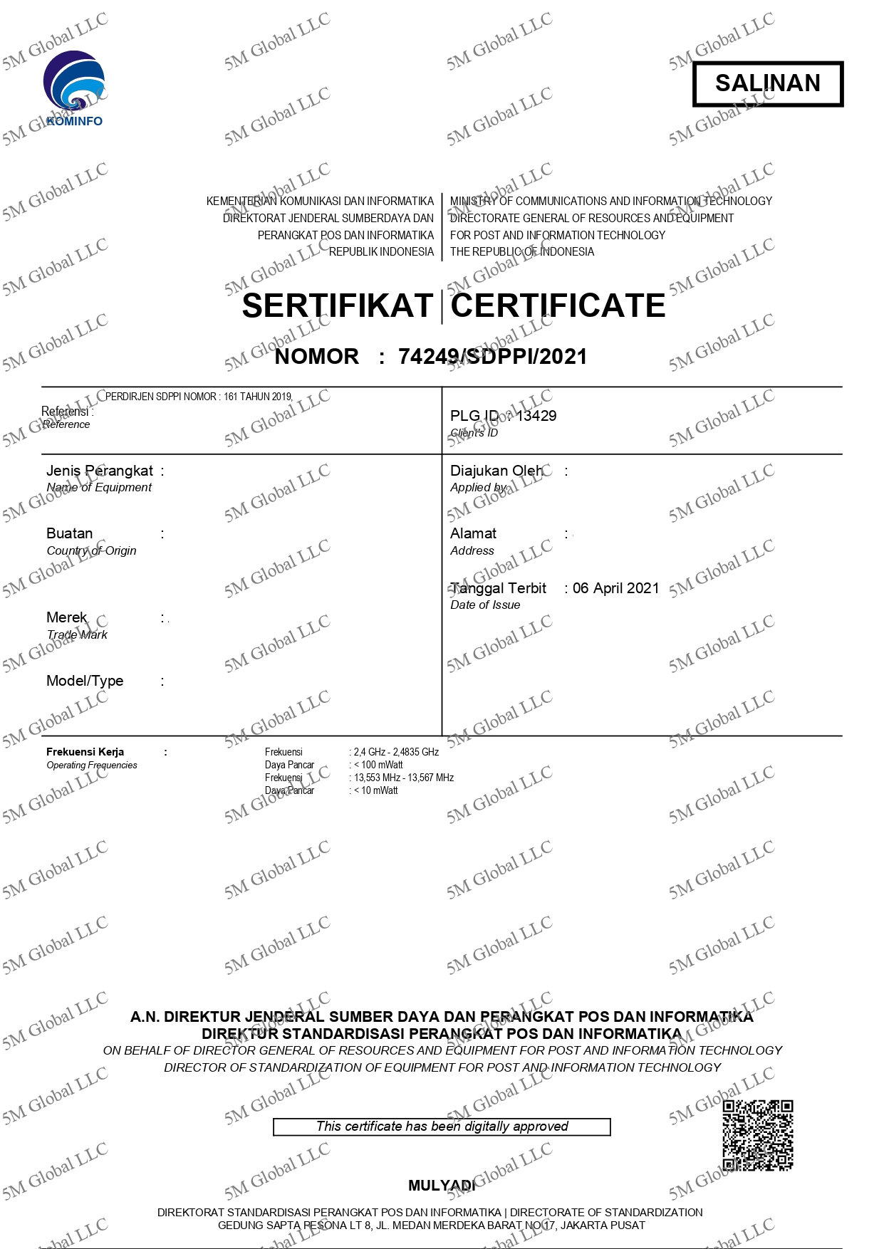 Authority :Directorate General of Resources and Equipment of Post and Information Technology of the Republic of Indonesia (SDPPI)
