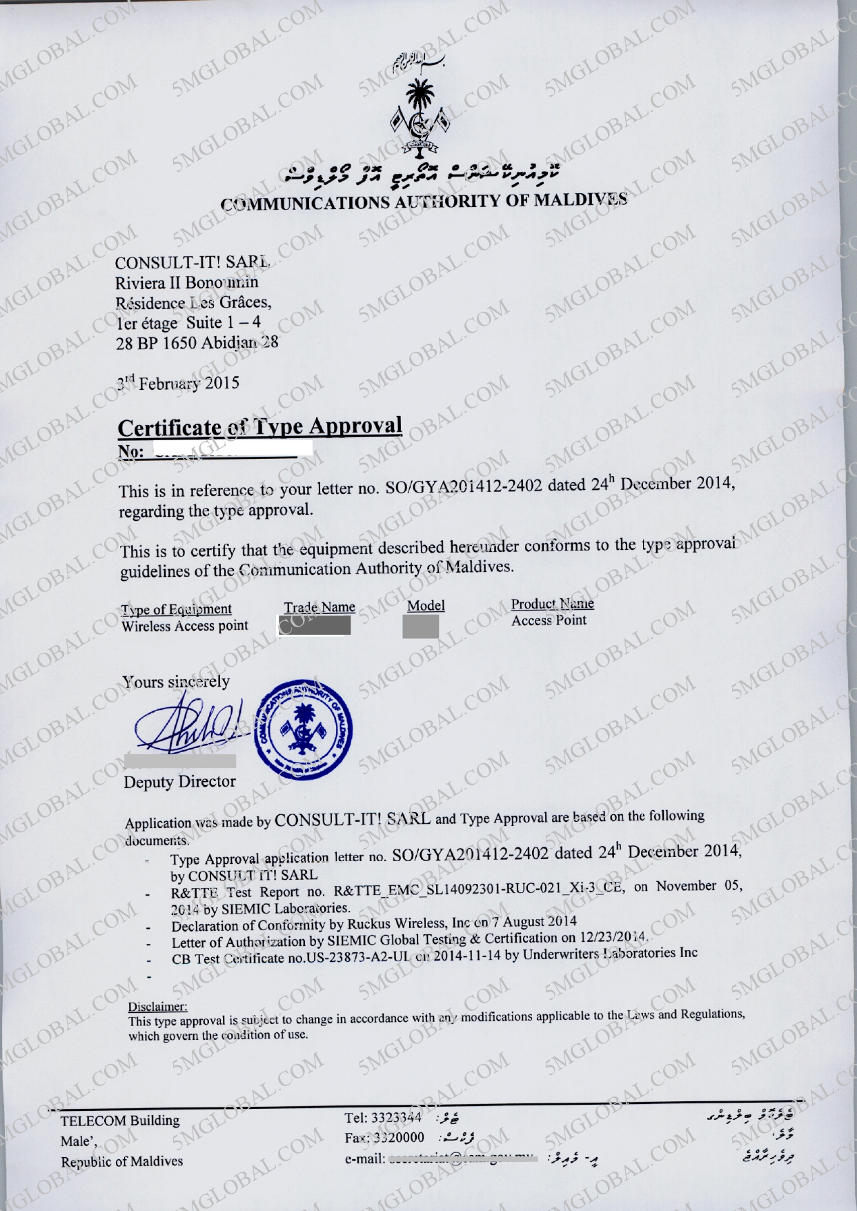 Communications Authority (CAM) of Maldives . This means that we can ensure all your applications for regulatory type approval in Maldives are processed fast and without undue complications. The range of products that we can get type approvals for is extensive and includes products that come under the category of Telecommunications, Wireless, Radio, Short Range devices and IoT devices. Since we started operations, we have done multiple Regulatory Type approvals in Maldives for various manufactures and Labs. Our specialty is that we have direct contact with the authority through a specific employee in country, who will handle all your Regulatory Type Approval needs.